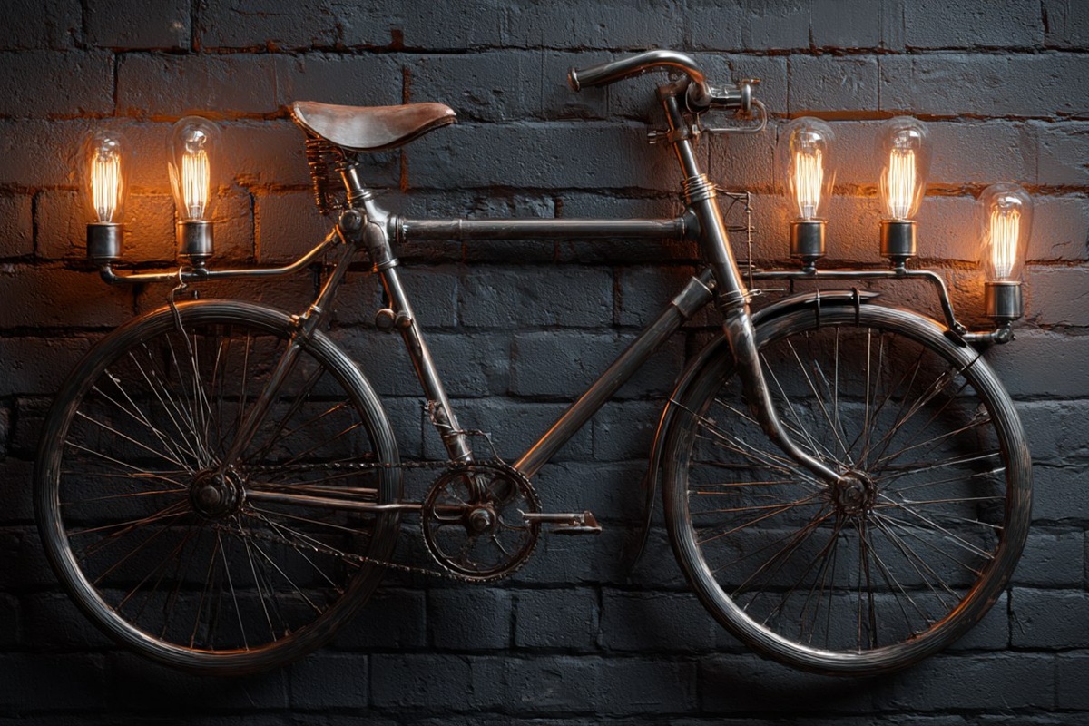 Diese Idee eignet sich ideal für Innenräume im Industrial-Stil, Werkstätten, moderne Wohnzimmer oder überdachte Außenbereiche. Der Hauptvorteil besteht darin, dass die Rohre des Fahrradrahmens hohl sind, sodass die elektrischen Kabel durch sie hindurchgeführt werden können. Auf diese Weise bleibt die Installation ordentlich und das Design fügt sich besser ein.