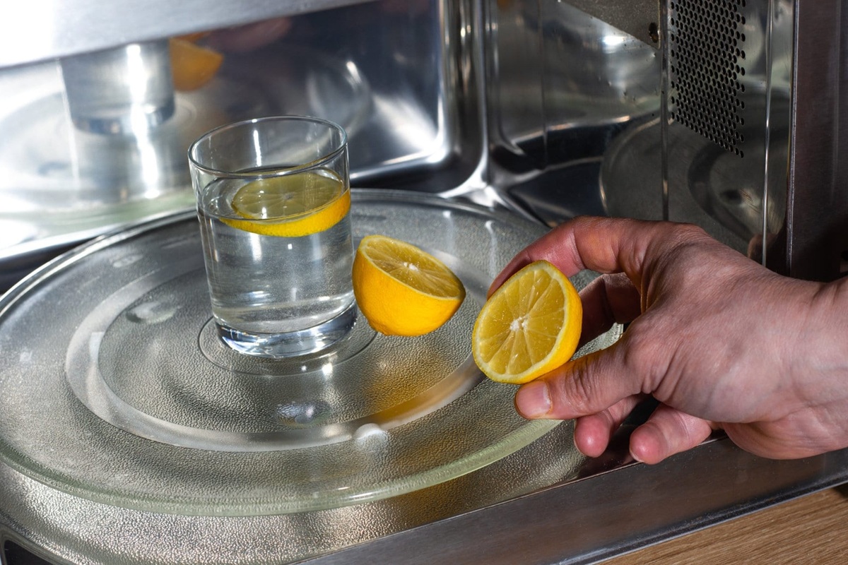Verwenden Sie einen Teller oder Behälter, der die Hitze der Mikrowelle verträgt (kein Kunststoff oder Styropor), und füllen Sie ihn mit Wasser. Schneiden Sie ein paar Scheiben Zitrone oder Orange oder beides und pressen Sie sie aus. Fügen Sie auch die Schalen hinzu.